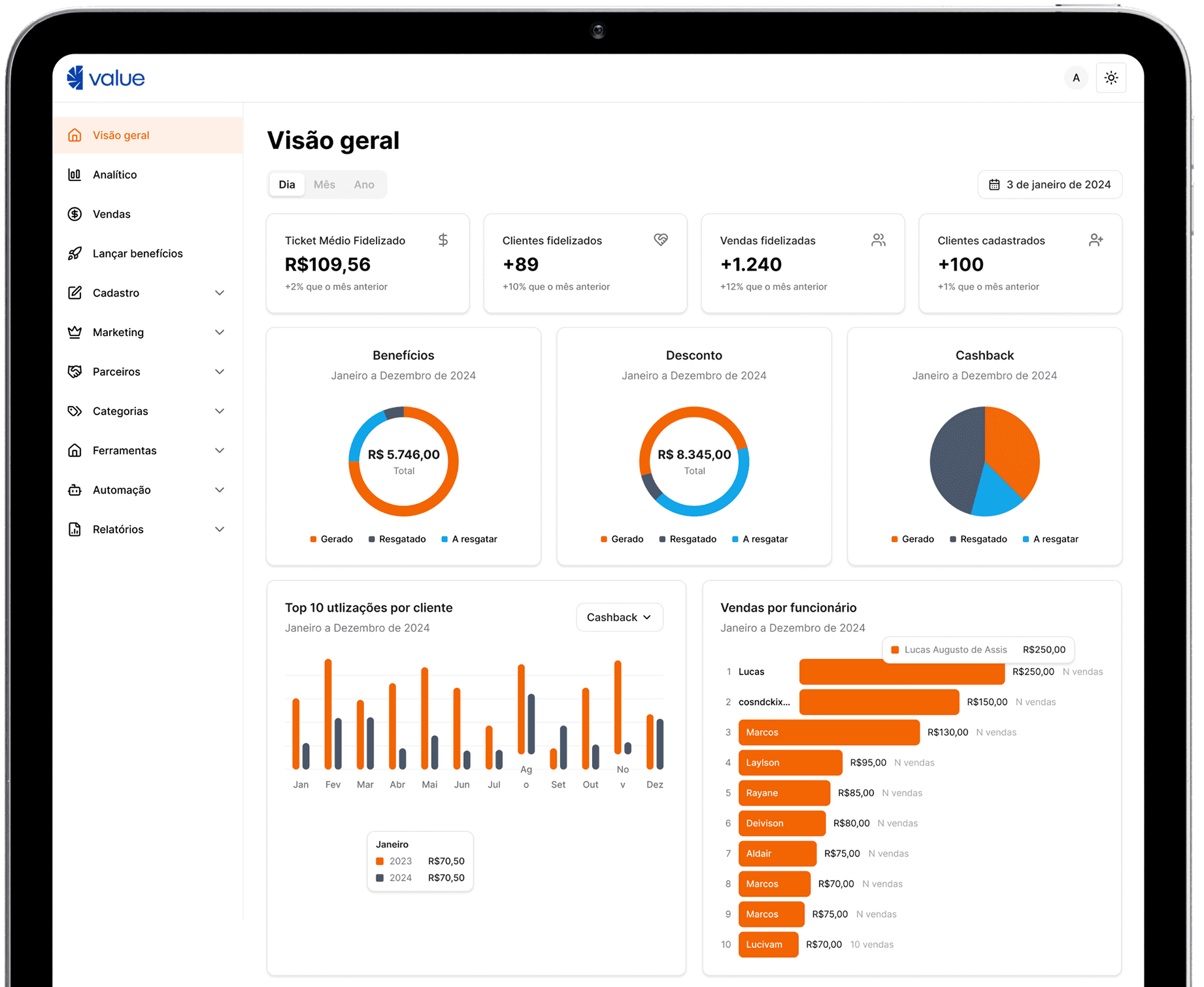 A Value oferece um app personalizado que incentiva a fidelização por meio de benefícios. Tenha em média 40% a mais de ticket médio com clientes fidelizados.